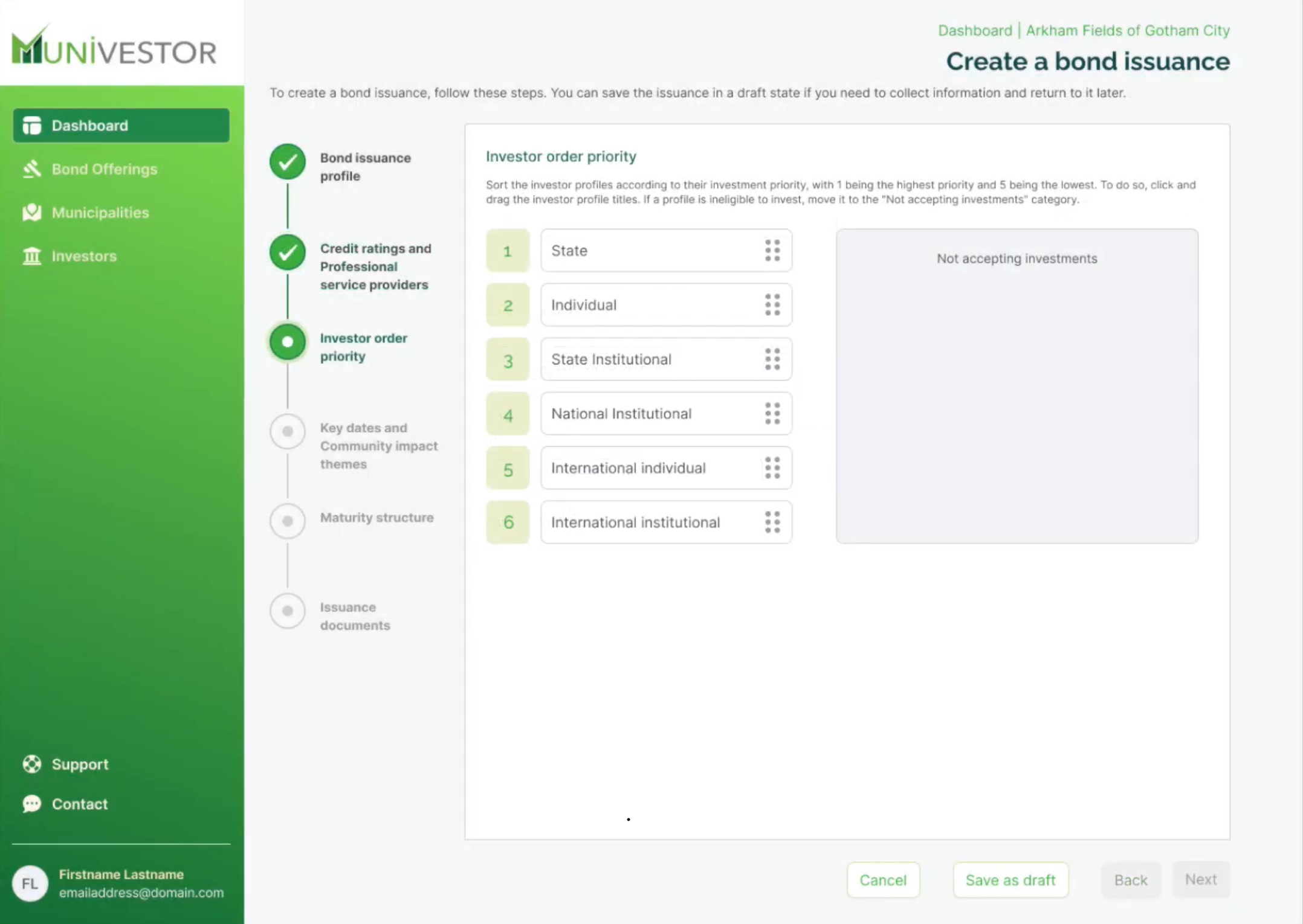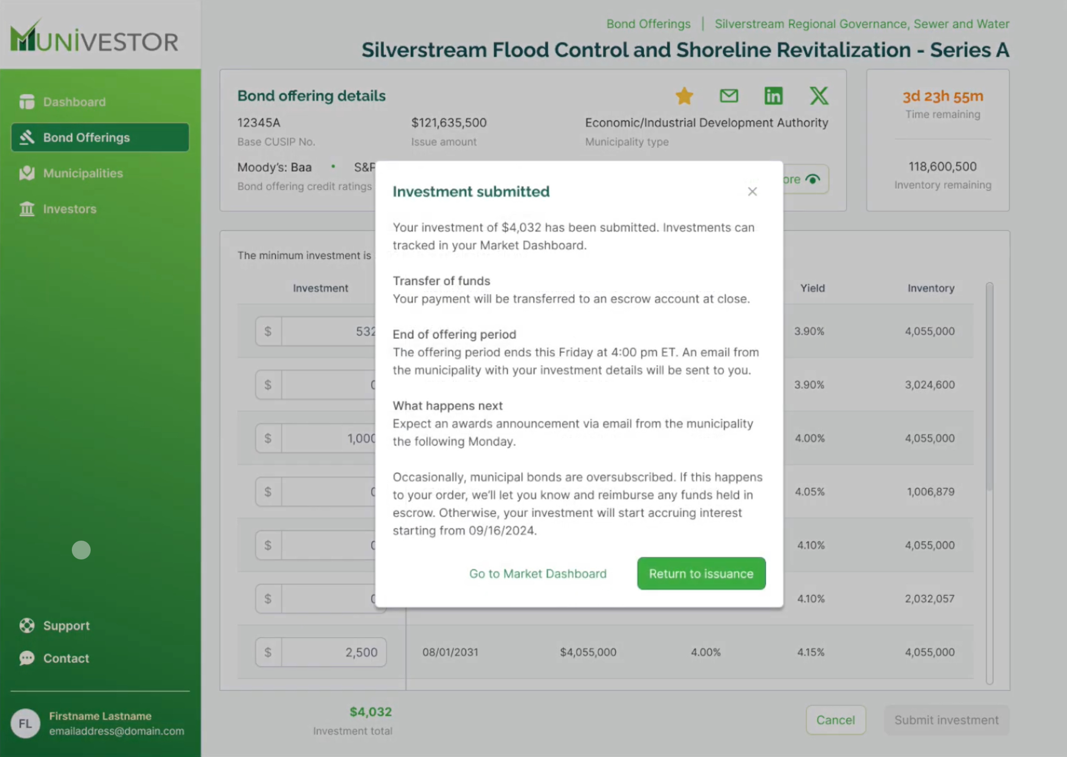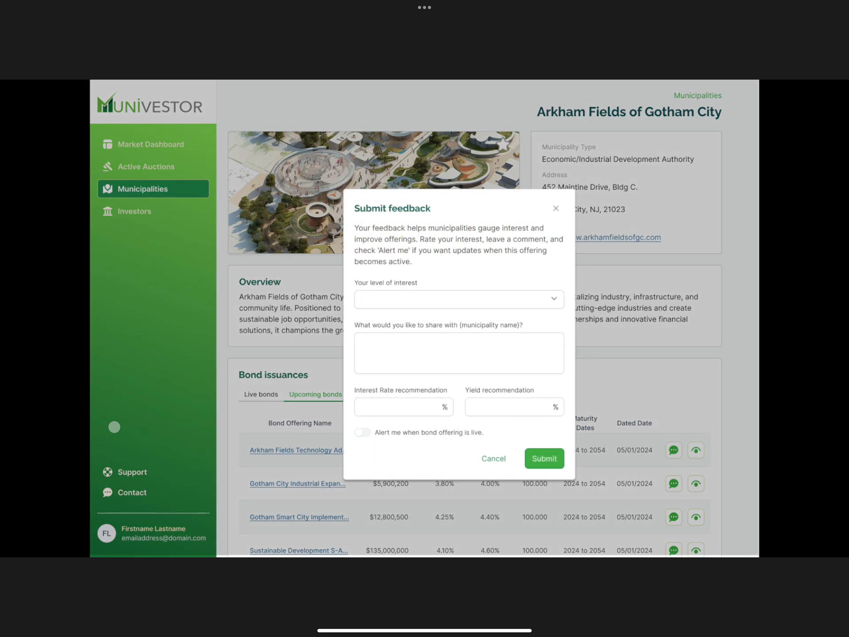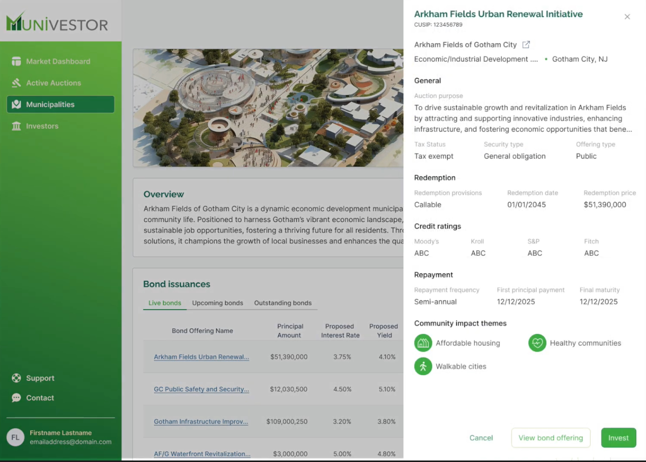 Munivestor steps in to offer an alternative issuance model that’s built for a different kind of market reality—one where cities have more control over their bond offerings, where the costs are more predictable and manageable, and where transparency is not an afterthought but a fundamental part of the process. Our digital marketplace opens up the field to both retail and institutional investors, providing an expanded pool of potential buyers and a more inclusive approach to financing. And with our focus on sustainable and impact-driven projects, we’re aligning with the growing demand for investments that don’t just deliver returns but also make a difference.