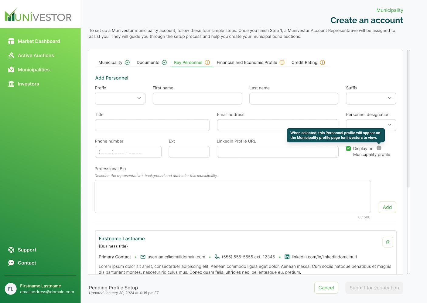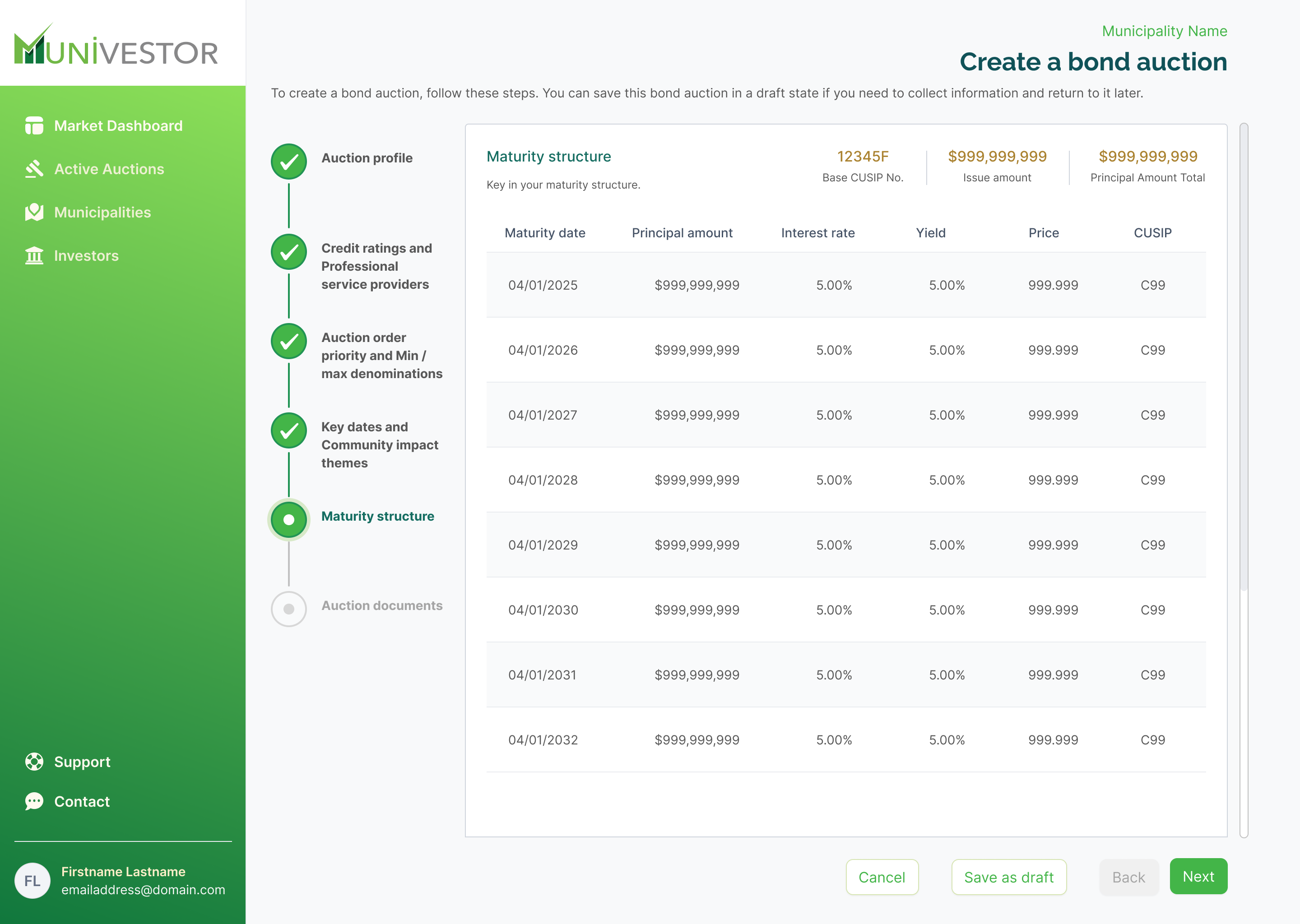 Market Professionals: Municipalities don’t go it alone—they rely heavily on professionals like bond attorneys, municipal advisors, and special project managers to execute bond transactions. Our platform is designed to integrate these professionals seamlessly into the process, giving them access to a municipality’s administrative panel to help manage online bond sales more efficiently