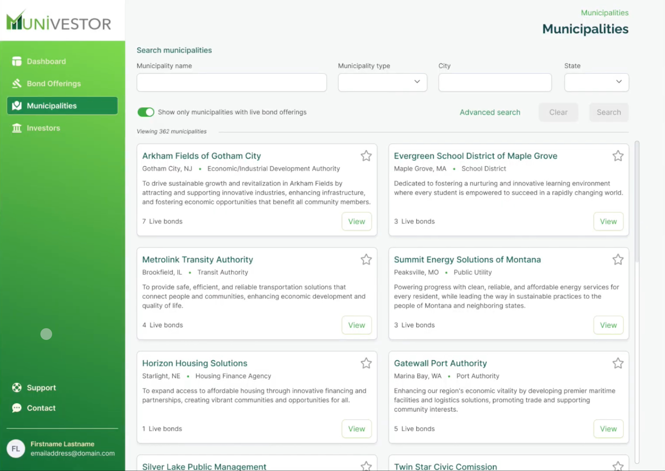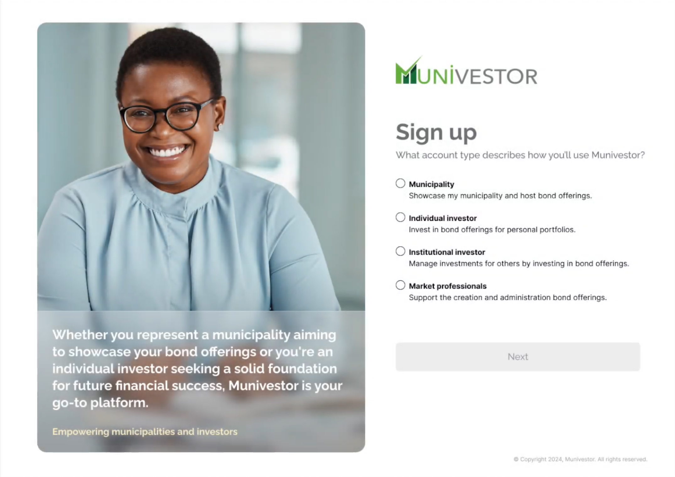 Munivestor is a financial technology company on a mission to democratize and expand the $4 trillion municipal securities market. We enable cities to raise capital directly from investors globally. Our regulated online marketplace empowers cities to create, market, and sell securities directly to investors of all sizes. Investors can also make secondary market purchases through Munivestor along with tracking market data. We are building a democratized global municipal finance marketplace that empowers communities to interact directly with the world.
